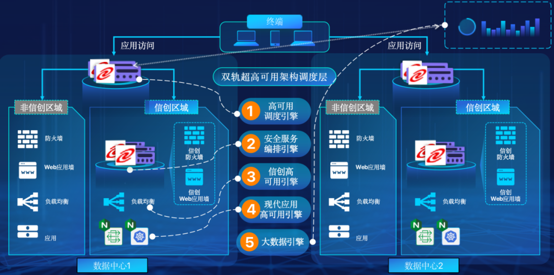 双轨超高可用架构拥有五大引擎,分别是:高可用调度引擎、安全服务编排引擎、现代应用高可用引擎、信创高可用引擎、大数据引擎,可以帮助客户在新架构下, 提升应用可持续性,解决性能瓶颈,提升稳定性。在服务异常情况下,可以通过实时灰度调度的方式,实现业务的应急逃生,保留应用故障现场环境,便于后续的排错与根因定位。