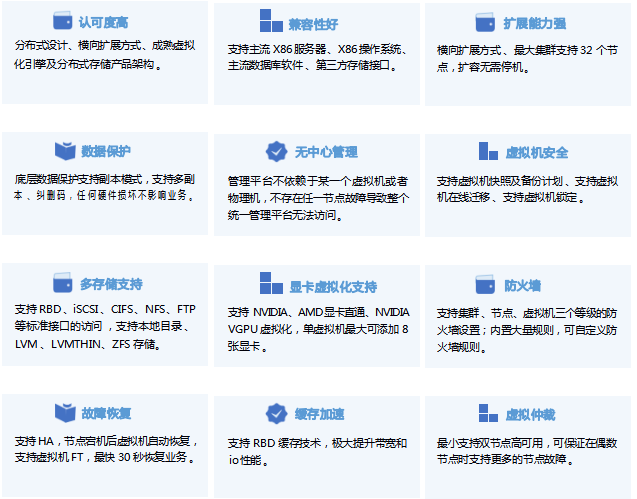 虚拟化场景融合计算和存储资源,提供具有极简 、高效 、可靠的虚拟化环境 。提供 OS 一键式交互安装,支持业务的快速上线,灵活扩展 。对各类资源统一管理,按需分配,支持一键巡检 、历史性能数据统一监控 。支持第三方虚拟化管理平台 、CDP 保护平台 。支持数据多副本及 EC 技术 ,大幅提升用户可得容量 。提供多种安全可靠策略 ,HA 高可用 、备份计划,虚拟机保护,保障业务连续 。